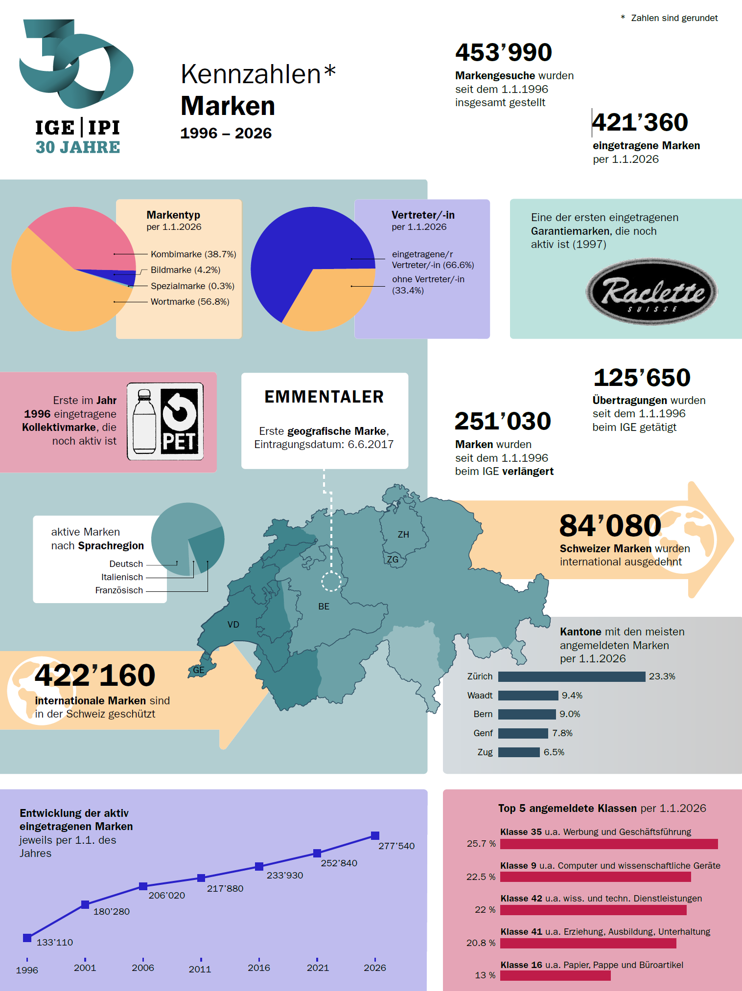 Ein Blick auf die letzten 30 Jahre zeigt vor allem eines: Die Zahl der Markeneintragungen ist kontinuierlich gestiegen. Seit dem 1. Januar 1996 wurden beim IGE rund 453’990 Markengesuche eingereicht. Per 1. Januar 2026 waren im Schweizer Markenregister insgesamt rund 421’360 Marken eingetragen. Der Markenschutz dauert 10 Jahre und kann danach verlängert werden. Seit 1996 wurden rund 251'030 Verlängerungen vorgenommen.