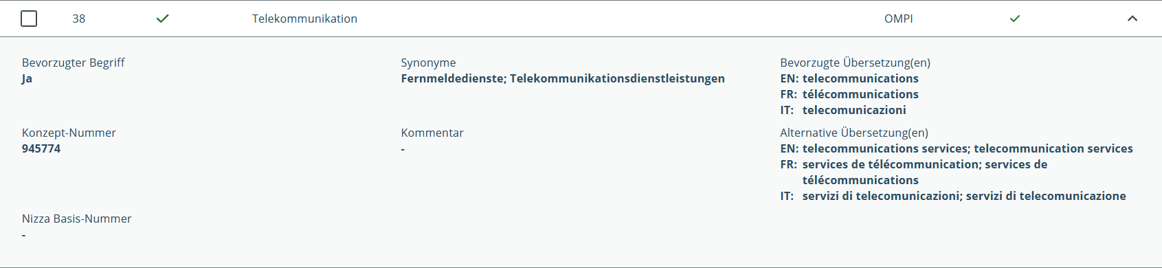 Alle Synonyme, bevorzugten und alternativen Übersetzungen können in der Detailansicht mit Klick auf einen Suchtreffer eingesehen werden.