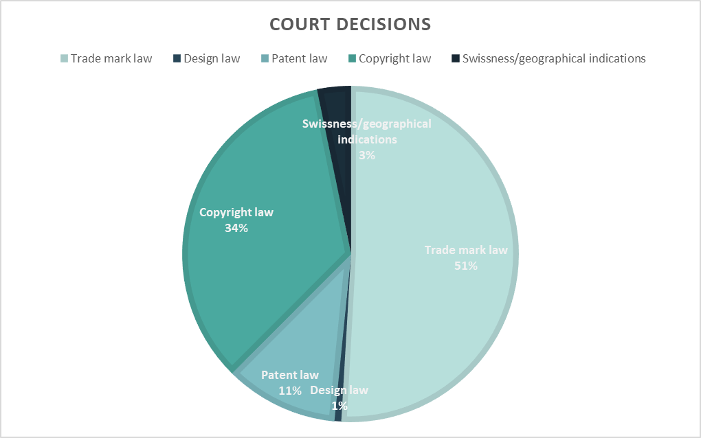 Figures and information on court decisions in Switzerland concerning intellectual property. The IPI is regularly informed of court judgments on intellectual property. In 2019, it was notified of 280 decisions.