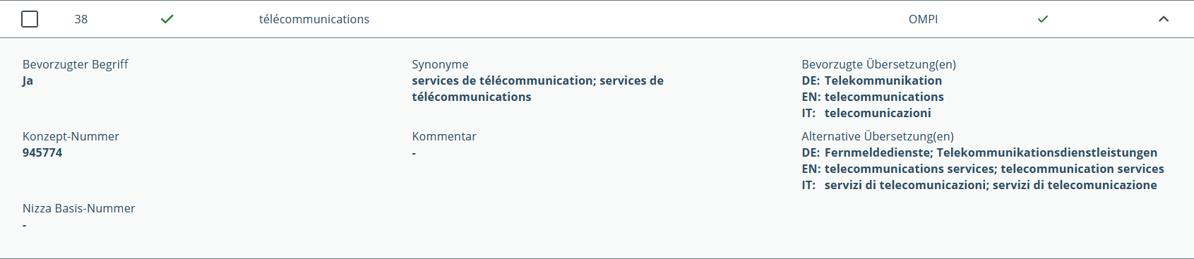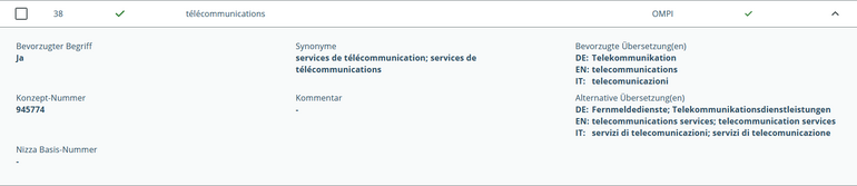Vous pouvez consulter l’ensemble des synonymes, des traductions privilégiées et des traductions alternatives d’un terme au moyen de l’affichage détaillé, accessible par un clic sur le résultat de recherche correspondant.