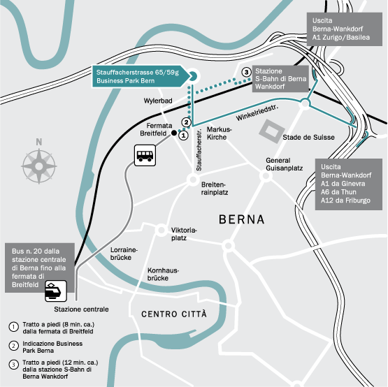 - Dalla stazione centrale di Berna: con il bus n. 20 in direzione Wankdorf Bahnhof fino alla fermata Breitfeld, 7 minuti. Dalla fermata, tratto a piedi di ca. 8 minuti passando all'incrocio tra la Stauffacherstrasse e la Standstrasse, seguire le indicazioni per il Business Park.