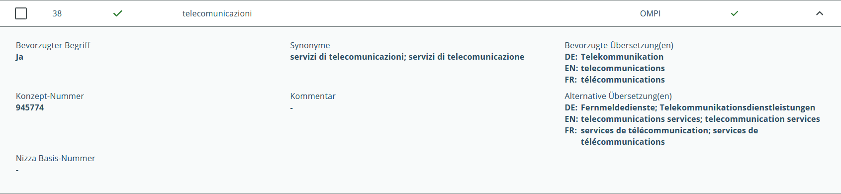 Tutti i termini presenti nella banca dati sono raggruppati in gruppi multilingue, denominati concetti, purché abbiano lo stesso significato. All’interno di un concetto, in ogni lingua disponibile un termine è definito come «termine preferito». Questo viene utilizzato nella lingua di destinazione per la traduzione di tutti i sinonimi della lingua di partenza.